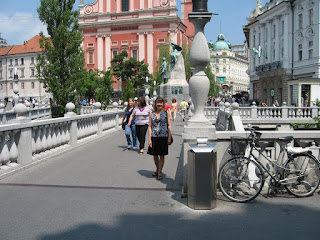 We wandered around the old town and bridges over the narrow river all morning. The pictures are of the river, the famous triple bridge linking 3 streets at Preseren Square with one street on the other side of the river, and the Dragon Bridge (with dragons that apparently wag their tails when virgins walk by) and me standing with a statue of the Devil (our good friend Dan Drost). Then we bought some tomatoes, apricots and "klobosa" sausage (from a Slovenian with an uncle in Vancouver) in the market. With really good buns from one of the bakeries we headed off to one of the parks for a picnic lunch in the shade. It's about 30 degrees but there's a breeze so it's hot but not unbearable.