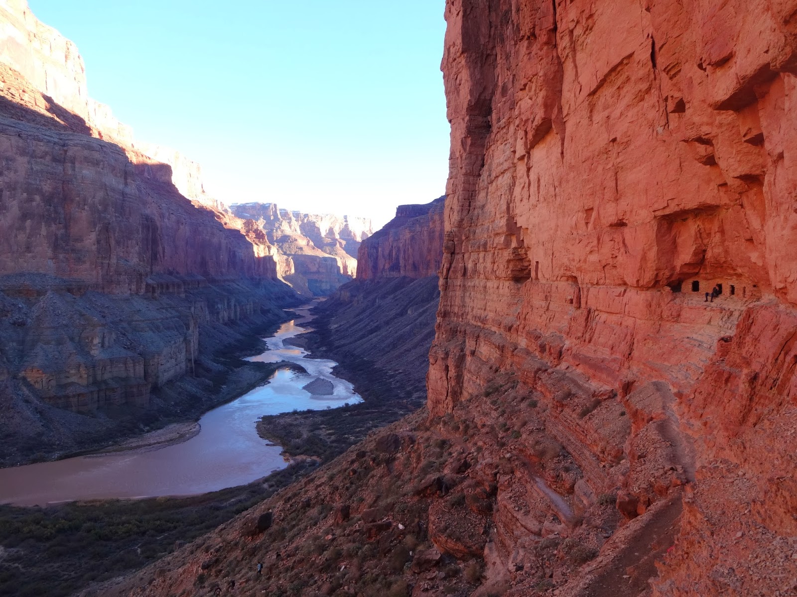 In the morning, a group of us climbed up a steep slope to the first rim, where Zack and I posed for a photo. There are so many layers to the canyon that it's difficult to know if distant peaks are just that or are part of the uppermost rim. The canyon is so vast that there are only a couple of places where the actual outer rim is visible from the river itself. The incredible size of the canyon is difficult to relate.